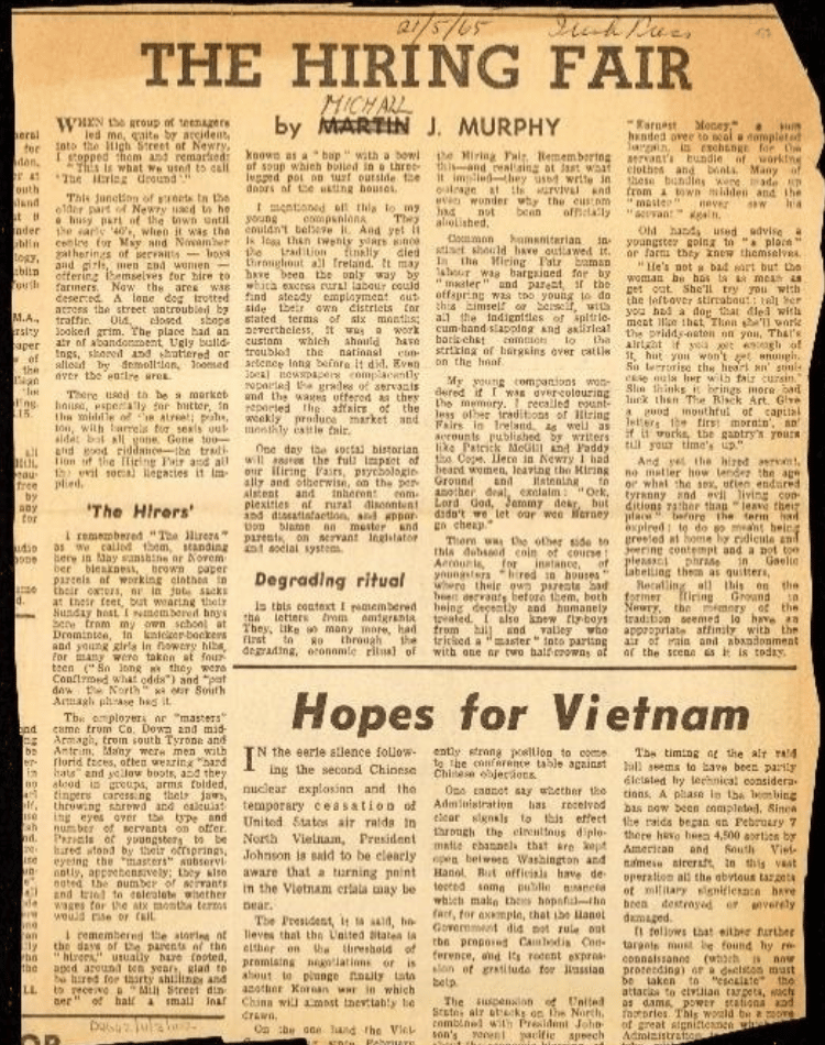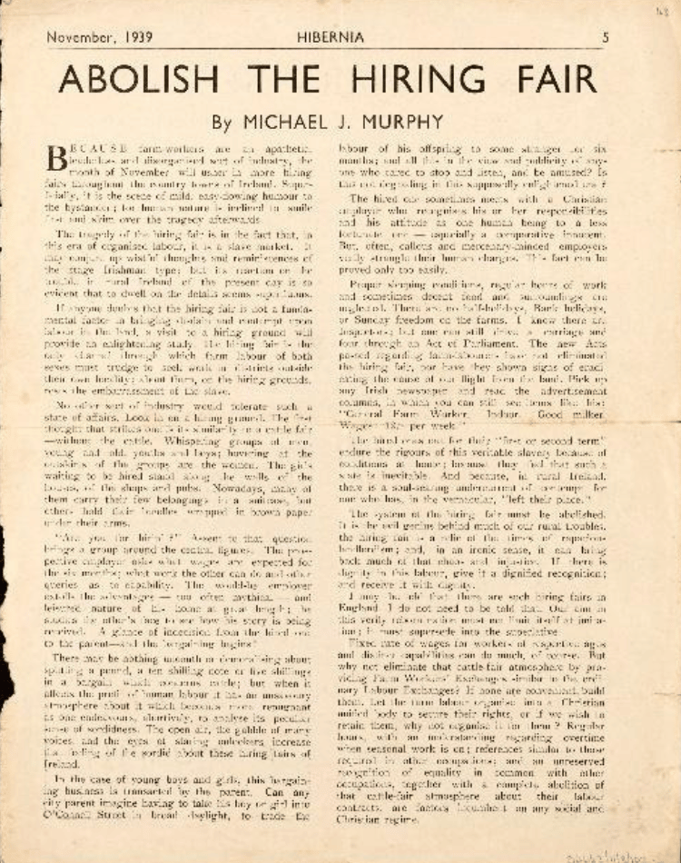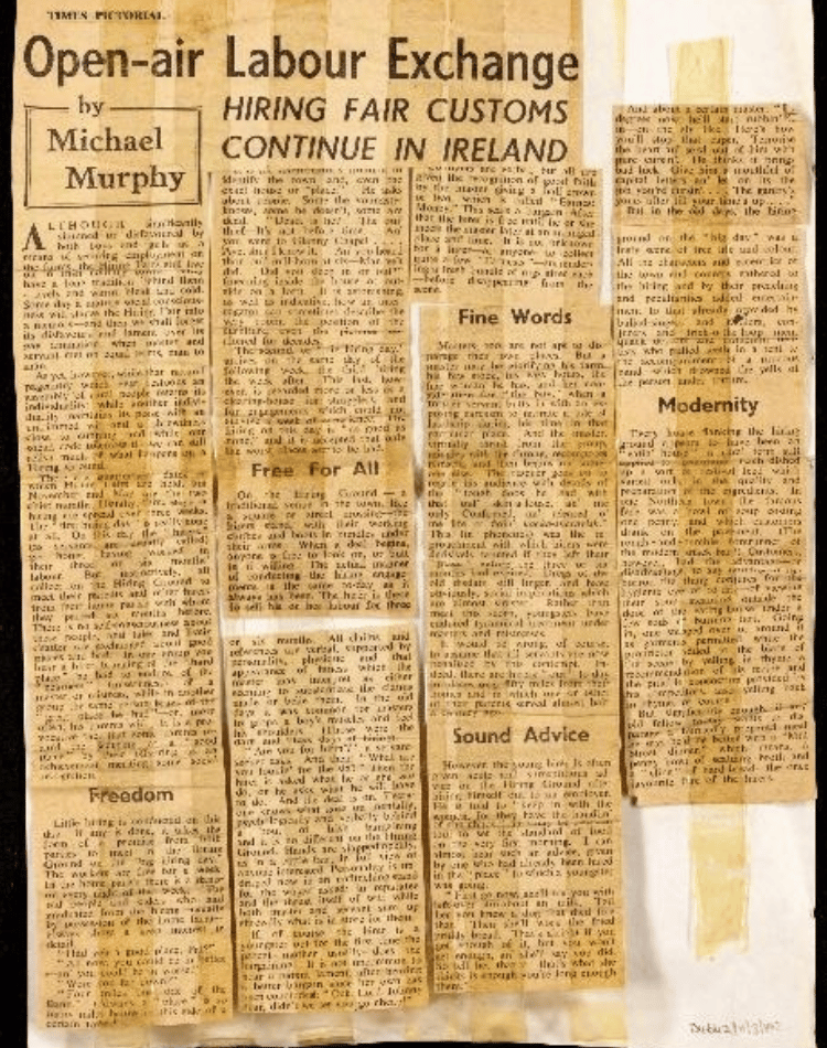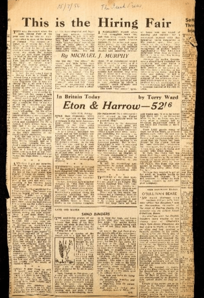 Below we can see four articles about the custom of the Hiring Fair written by Murphy between the 1930s and 1960s. They are available to view (catalogue reference number D4642/11/3/102) onsite in PRONI and will be available to view in the PRONI eCatalogue and at Tí Chulainn, Mullaghbane by the end of December 2025. The articles are a good representation of Murphy’s constant reworking of similar themes throughout his career.